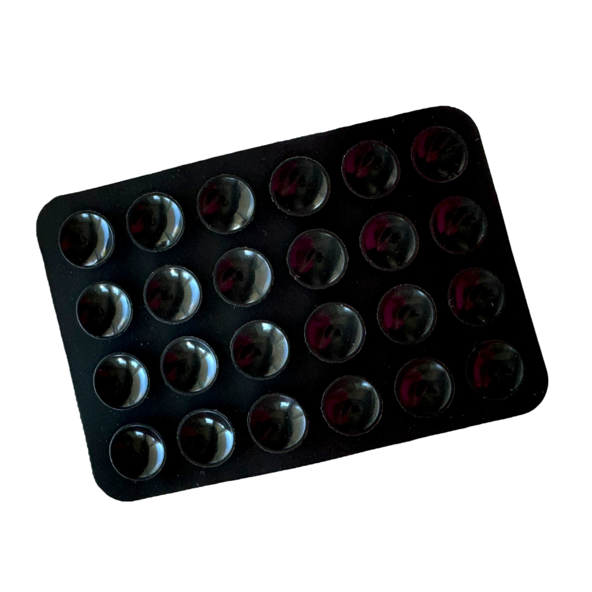 Image Description: A black rectangular pad with 24 small, evenly spaced suction cups arranged in four rows of six. The suction cups are glossy and slightly raised from the surface, designed to grip flat objects like a phone or a smooth surface. The pad has rounded corners and a flexible, rubber-like texture. It’s compact and designed for portable, hands-free use.