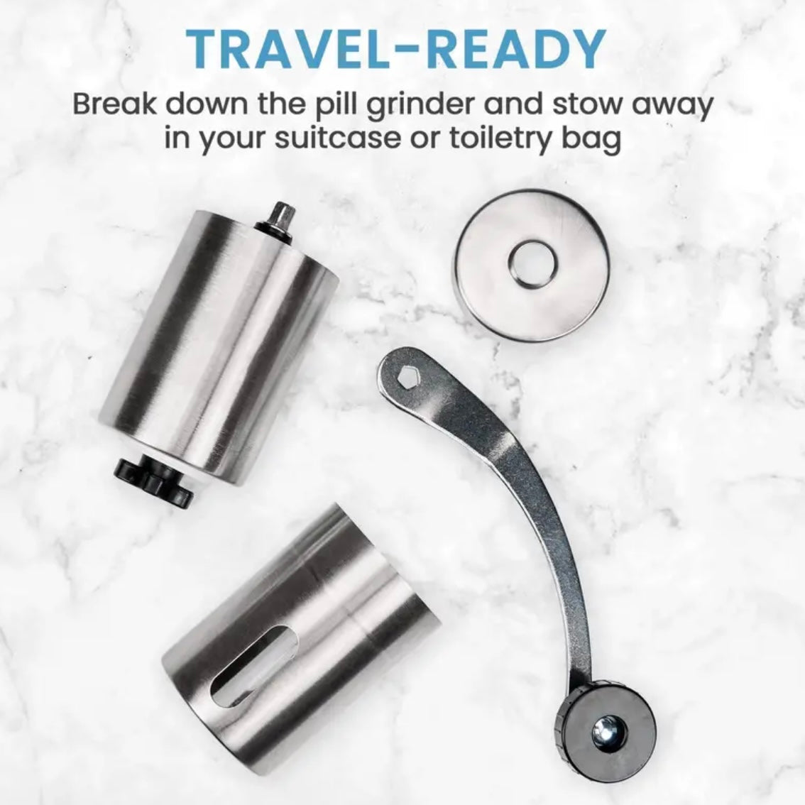 Image Description: The image shows a handheld pill grinder made of sleek stainless steel. The grinder features a cylindrical body with a long, curved metal handle on top, ending in a black knob for easy turning. The base of the grinder has a transparent window that shows the crushed powder inside. Next to the grinder, there is a small pile of finely crushed powder, demonstrating the consistency that can be achieved.