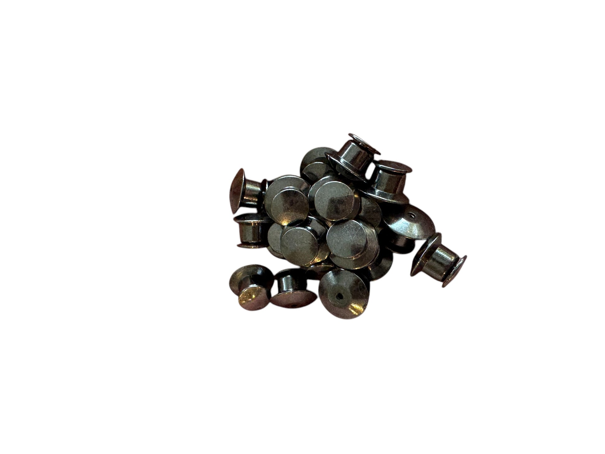Image Description: The image displays locking pin backs in both gold and silver finishes. The pin backs have a cylindrical shape with a flat, circular top and bottom, featuring a small hole in the center for the pin post. The polished metal surfaces give a sleek and elegant appearance.