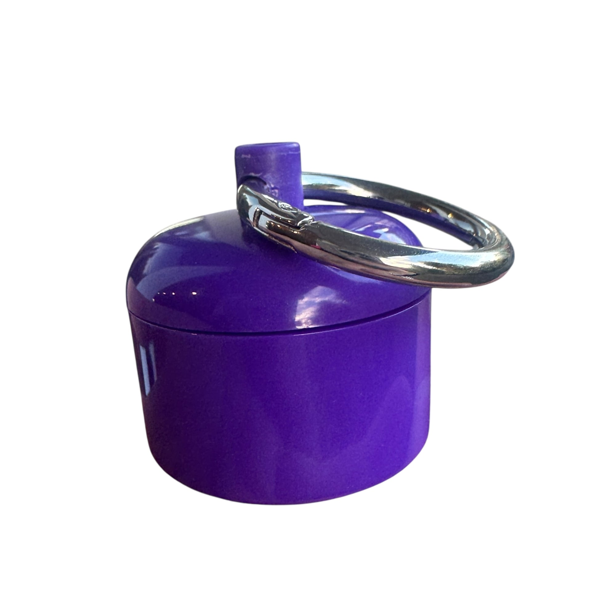 Image Description: A small round purple case attached to a silver keyring clip. The case opens to store small items like rings, earrings, or keepsakes, keeping them safe and easy to carry. Its bright purple colour makes it stand out, and the keyring allows it to be clipped to keys, bags, or zippers for quick access.