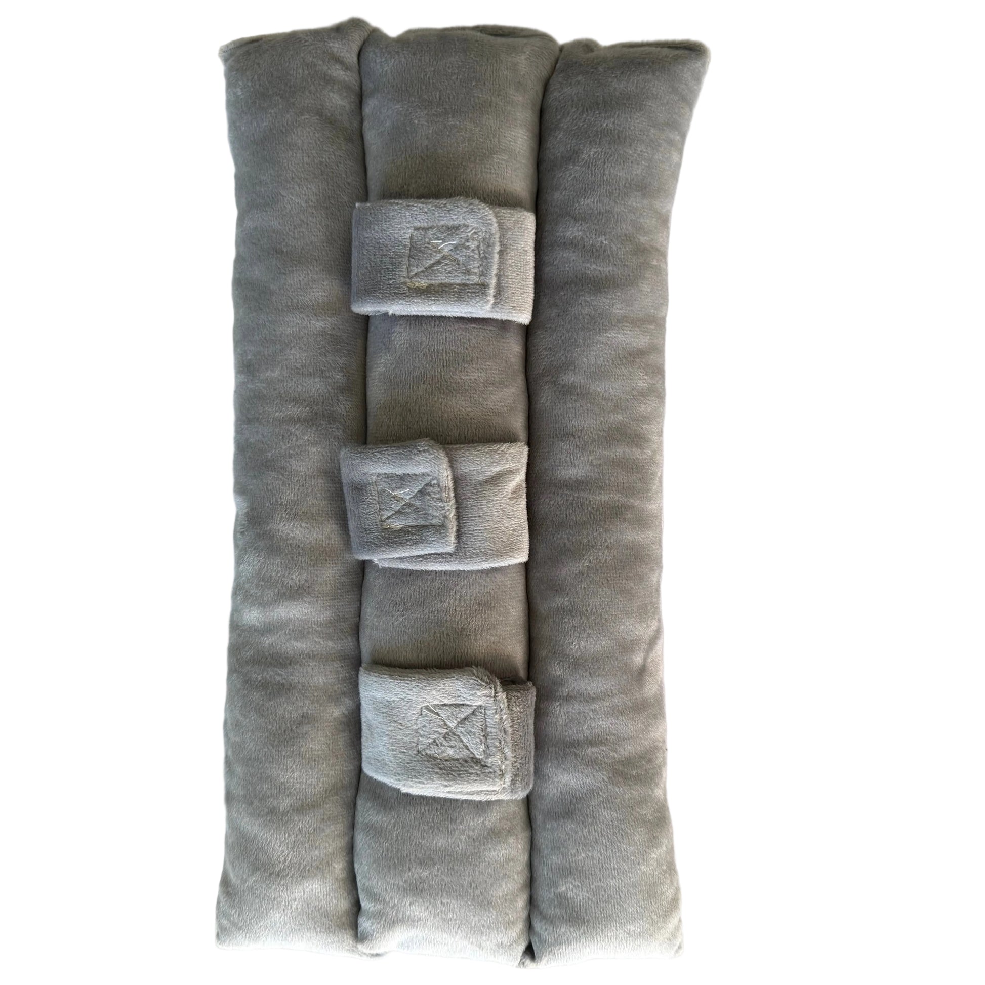 Image Description: A long, padded black cushion with adjustable straps, shown wrapped around a seatbelt. Demonstrated being used flat across the lap, to how it creates a comfortable barrier between the body and the seatbelt.
