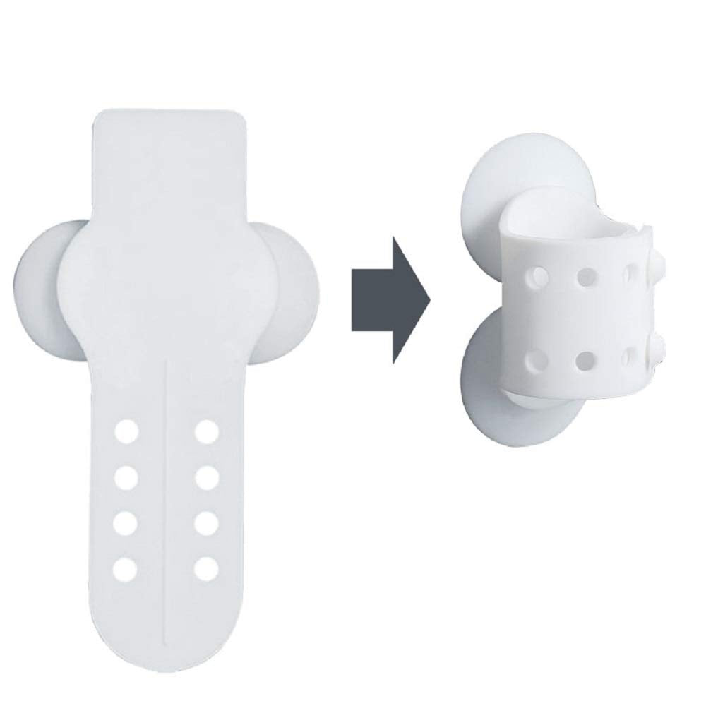 Image Description: A white silicone suction cup shower holder is shown in use and installation. It features two suction cups and an adjustable strap with multiple holes. The holder secures to smooth surfaces and fits different shower head styles. Images show it used for washing hair, bathing children or pets, and holding mops, highlighting its versatility and ease of use.