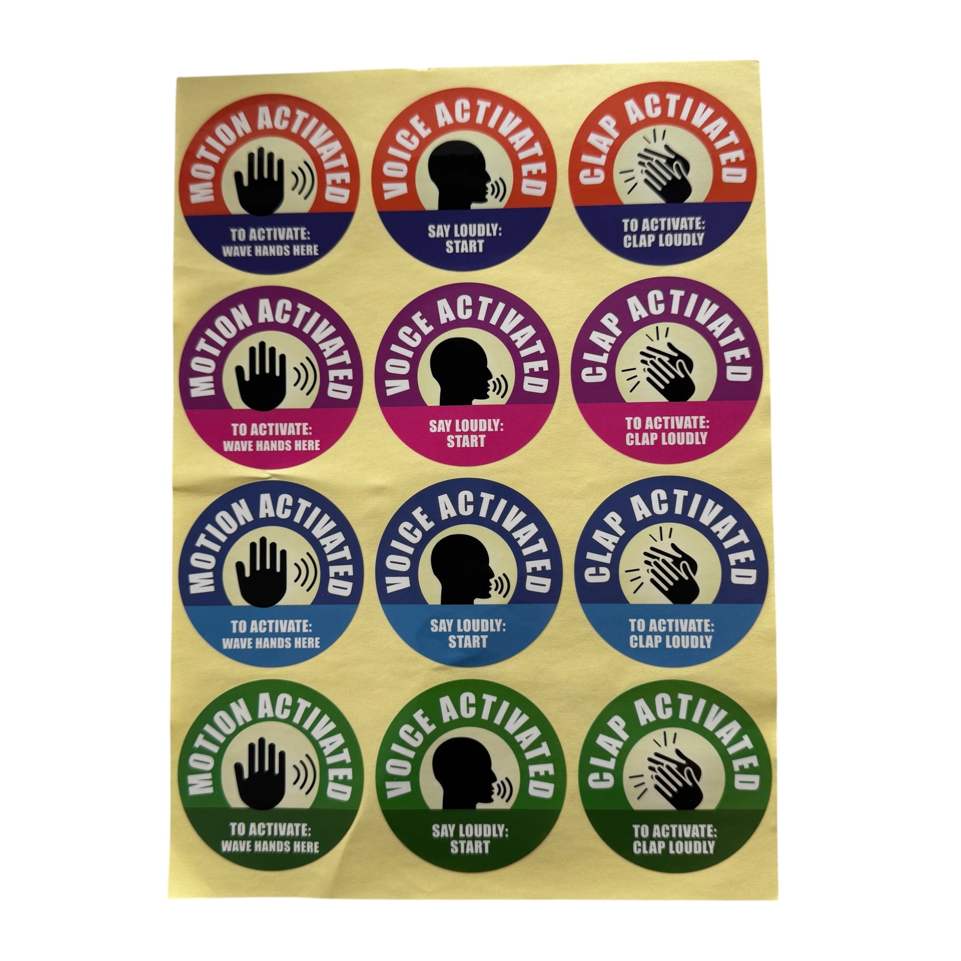 Image Description: A sheet of colourful round stickers with three designs. One reads “Clap Activated – To Activate: Clap Loudly” with a clapping hands icon. Another reads “Voice Activated – Say Loudly: START” with a speaking silhouette icon. The third reads “Motion Activated – To Activate: Wave Hands Here” with a raised hand icon. The stickers are shown in bright red, blue, green, and purple colours.
