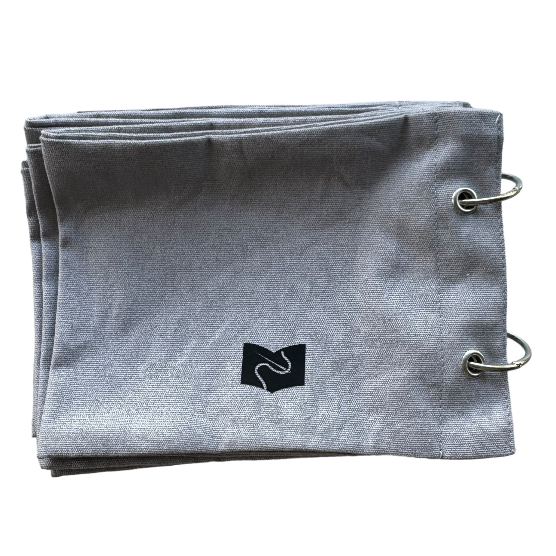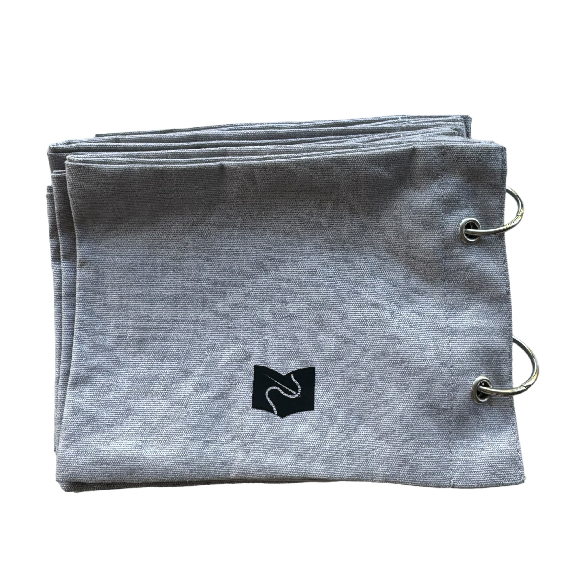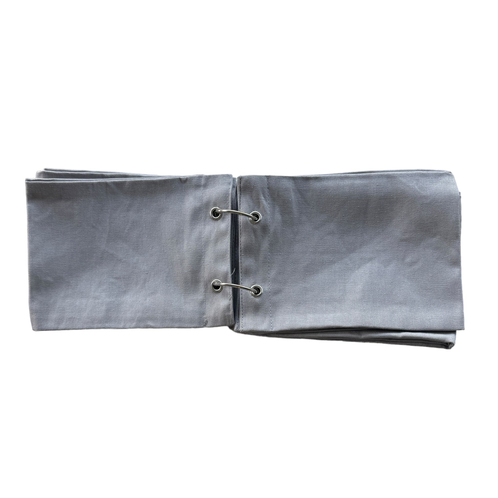 Image Description: Fabric sketchbook with a plain grey cloth cover, secured with two metal binder rings. Inside are blank fabric pages ready for embroidery, stitching, or decoration.