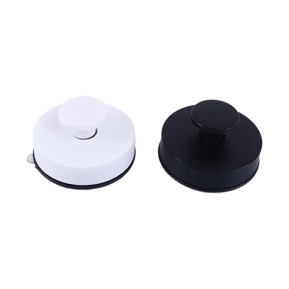Image description: A round suction handle available in black or white, shown attached to smooth bathroom and household surfaces. Demonstration images show it being cleaned, applied, and twisted to lock in place, holding lightweight items such as towels or accessories.
