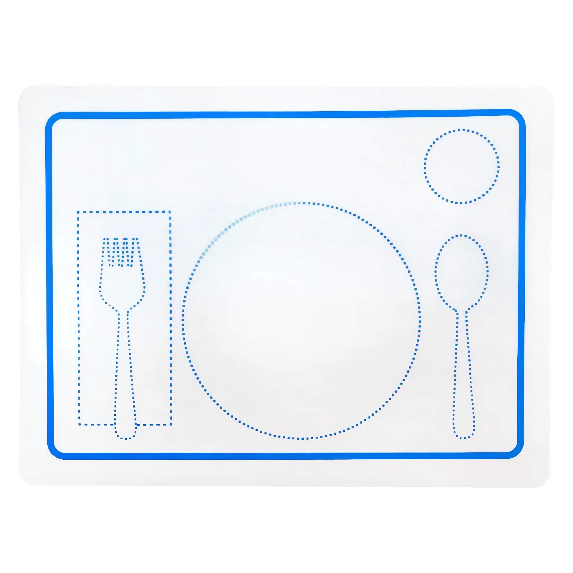 Image Description: Transparent rectangular placemat with a blue border and printed outlines indicating placement for plate, fork, spoon, and cup. The mat is flexible and slightly curved to demonstrate grip.